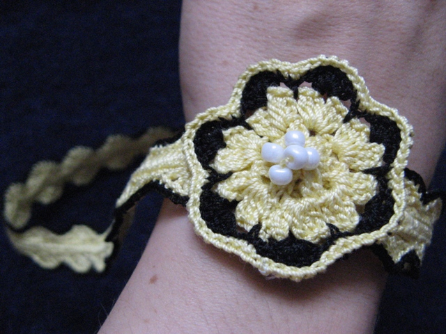 Для украшения повязки добавила вязанный цветочек и в центре пришила бусины. Использовала для этой повязки контрастные цвета - черный и желтый.